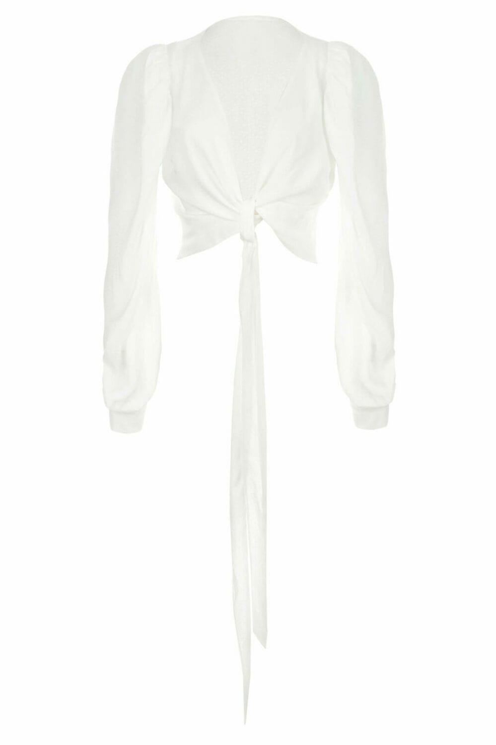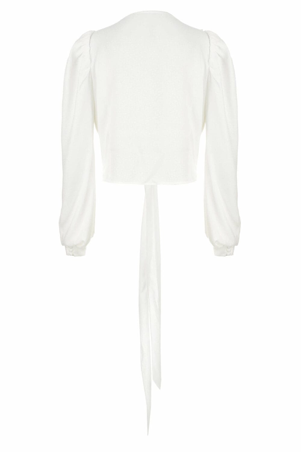 Bluzka z wiązanym dekoltem i bufiastymi rękawami. Możesz ją wiązać na kilka sposobów (z przodu, z boku, z tyłu) i sama regulować głębokość dekoltu. Bardzo wyjątkowy, a zarazem uniwersalny element ubioru, który może posłużyć za motyw przewodni, bądź bazę do innych stylizacji. Jedna rzecz – wiele możliwości!