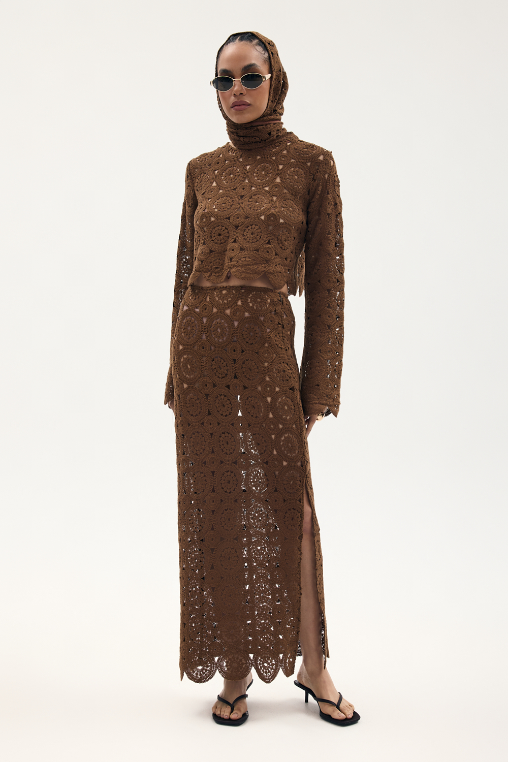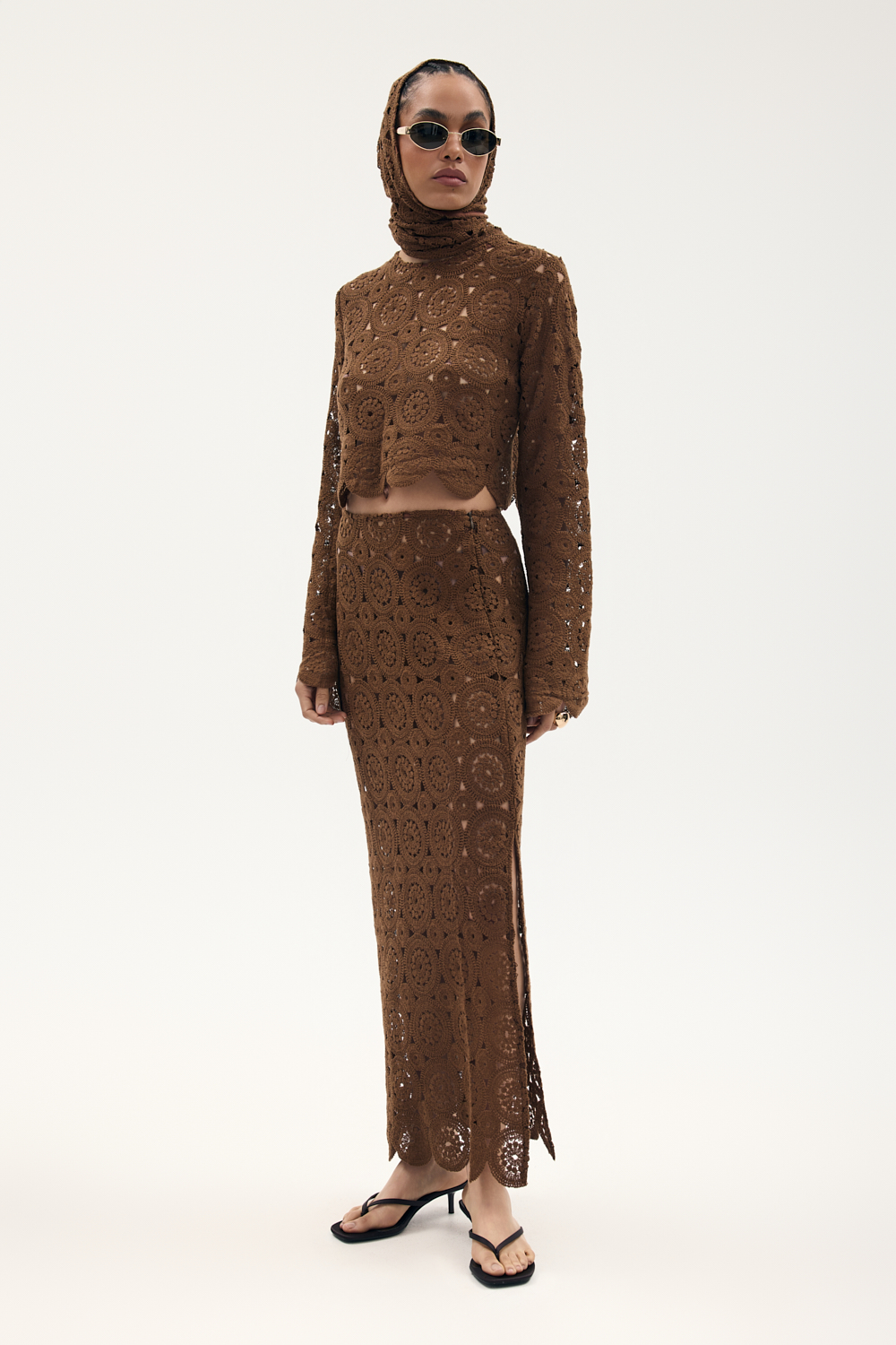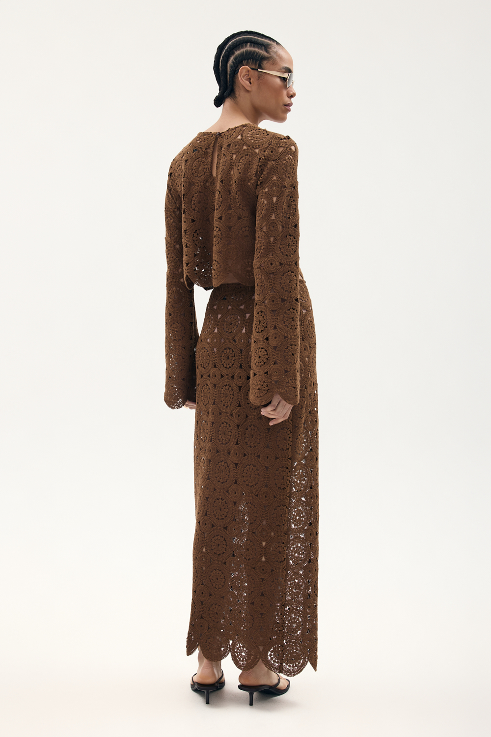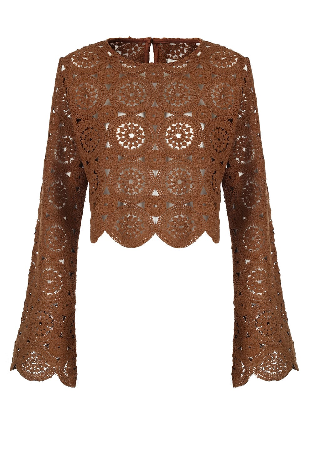 Bluzka o krótkim kroju z makramy bawełnianej z rękawem w dzwonek, z tyłu zapinana na guziczek.