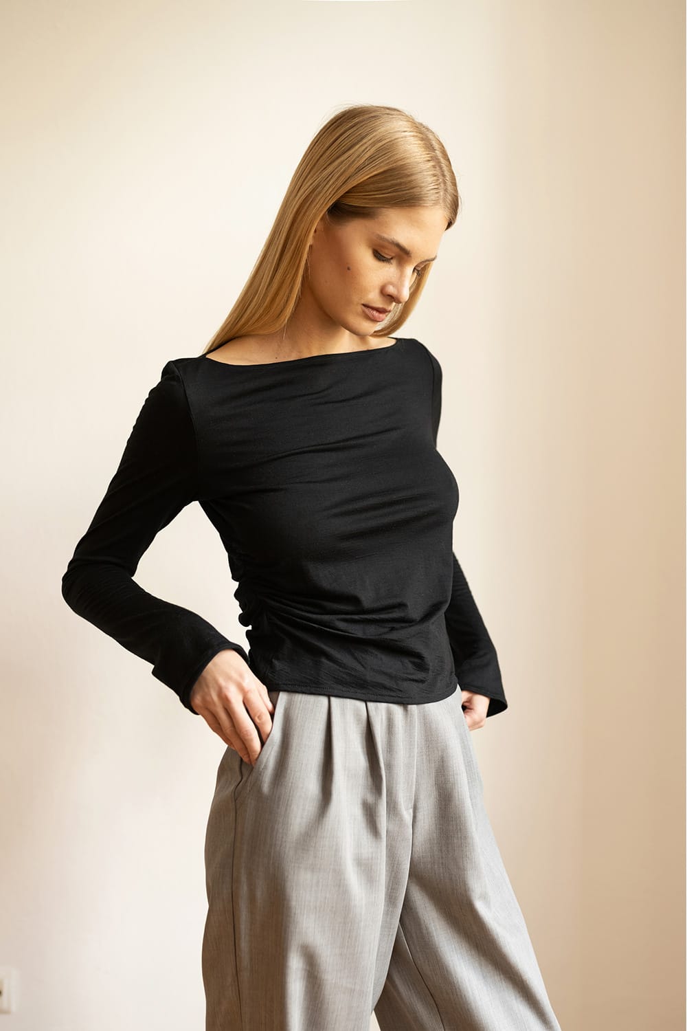 Klasyczny long-sleeve z dekoltem w łodkę i delikatnym drapowaniem z boku, wykonany ze szlachetnej wełny merino. To ponadczasowy basic, który kazda z nas powinna mieć w swojej szafie. Sprawdzi się dosłownie w każdej stylizacji, od sportowej do eleganckiej.