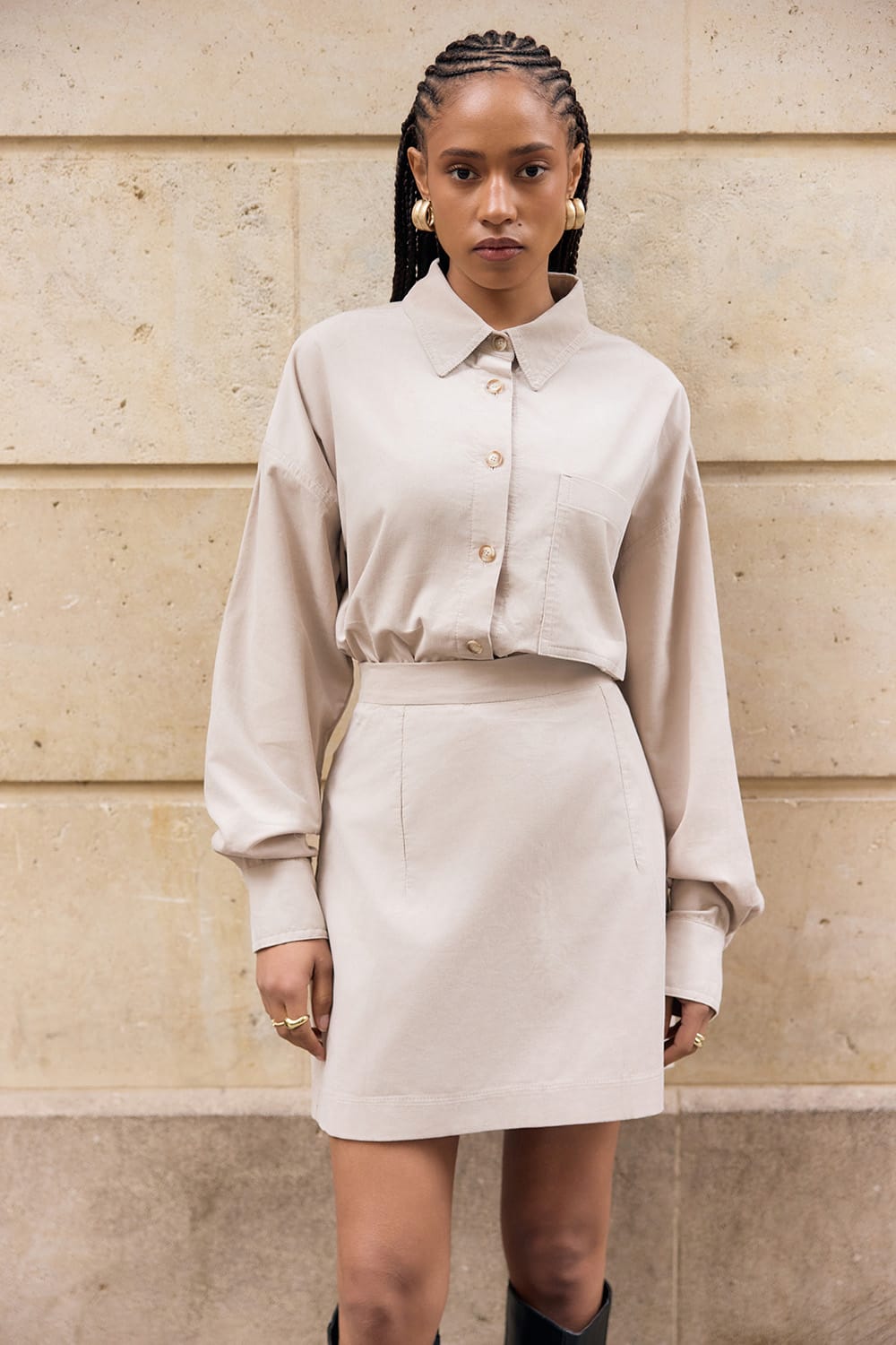 Spodniczka o kroju trapezu odszyta z miękkiego i przyjemnego sztruksy w kolorze kremowym odszyta ze sztruksu 100% bawełna, podszewka 100% wiskoza