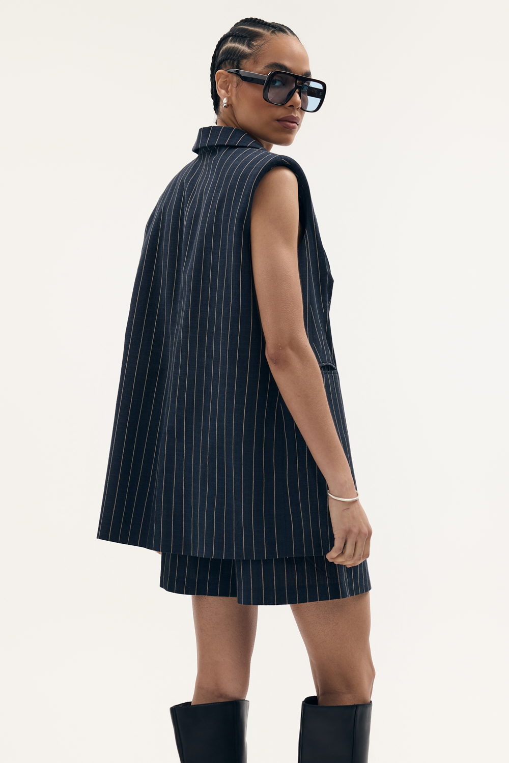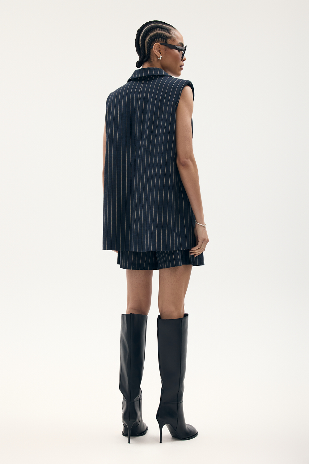 Długa kamizelka na podszewce z poduszkami na ramionach zapinana na guzik