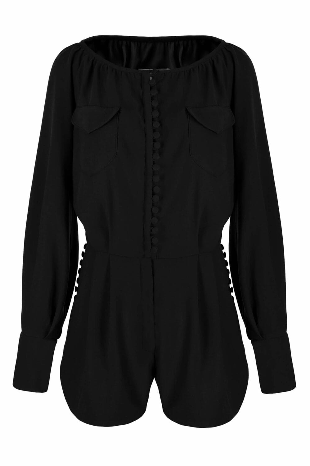Krótki kombinezon z szerokim mankietem i kieszeniami, zapinany na guziczki. Pięknie wykończony ręcznie kombinezon jest przykładem tradycyjnego krawiectwa najwyższej próby – każdy z oblekanych guziczków jest ręcznie przyszyty. Niezwykle wygodny i elegancki kombinezon doskonale podkreśla zalety sylwetki przy jednoczesnym komforcie użytkowania.