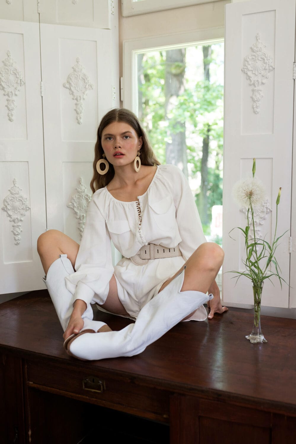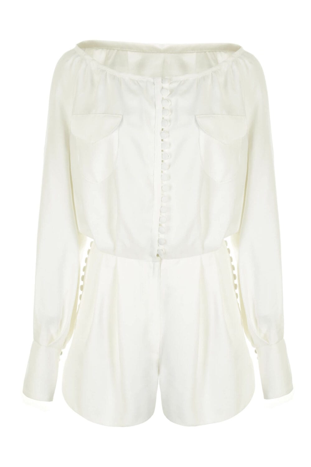 Krótki kombinezon z szerokim mankietem i kieszeniami, zapinany na guziczki. Pięknie wykończony ręcznie kombinezon jest przykładem tradycyjnego krawiectwa najwyższej próby – każdy z oblekanych guziczków jest ręcznie przyszyty. Niezwykle wygodny i elegancki kombinezon doskonale podkreśla zalety sylwetki przy jednoczesnym komforcie użytkowania.