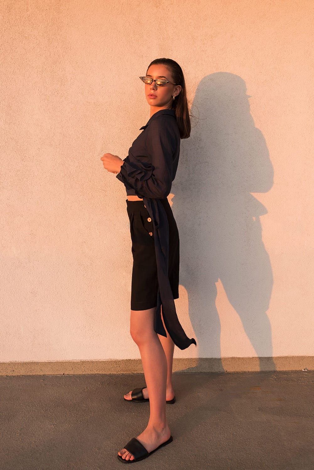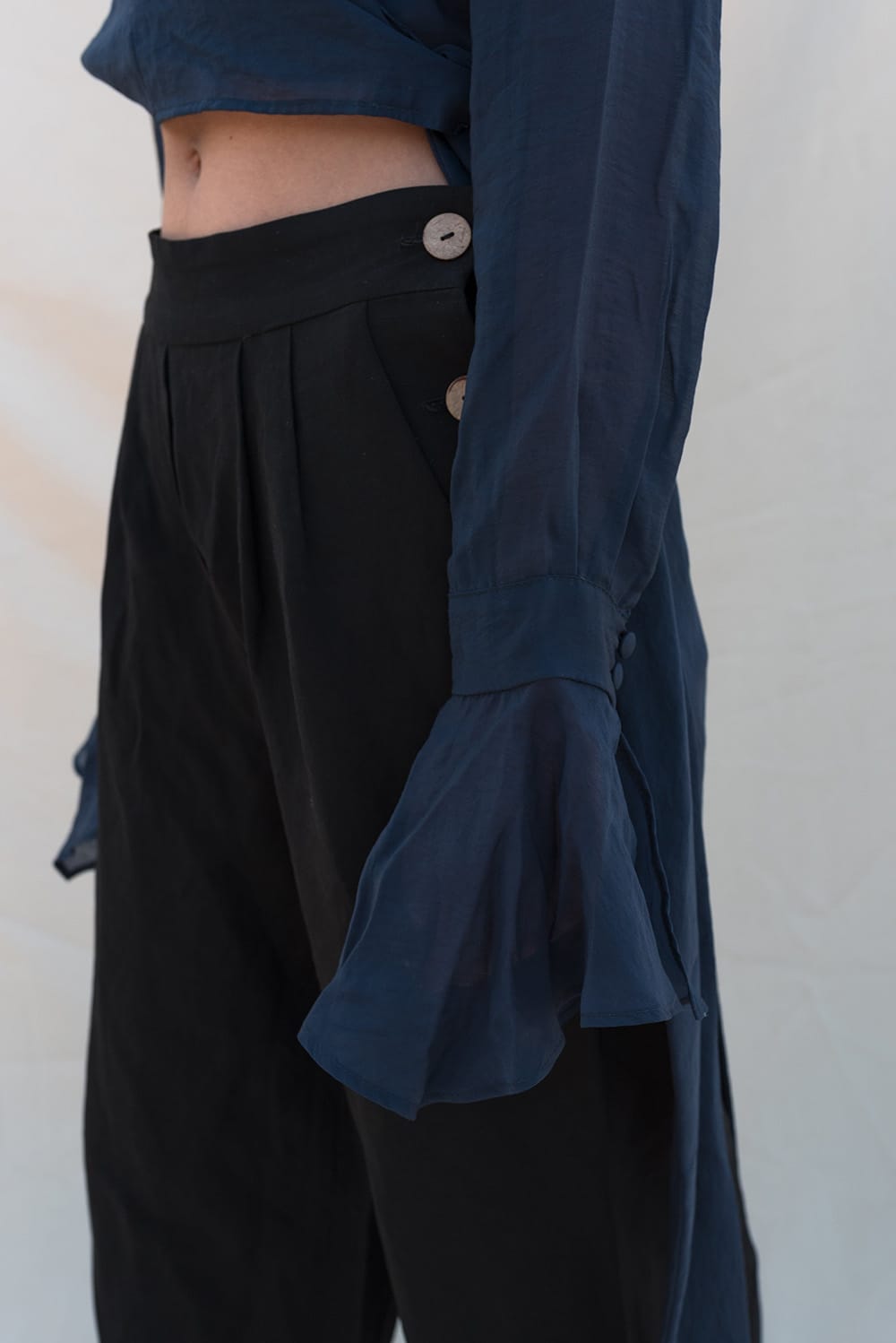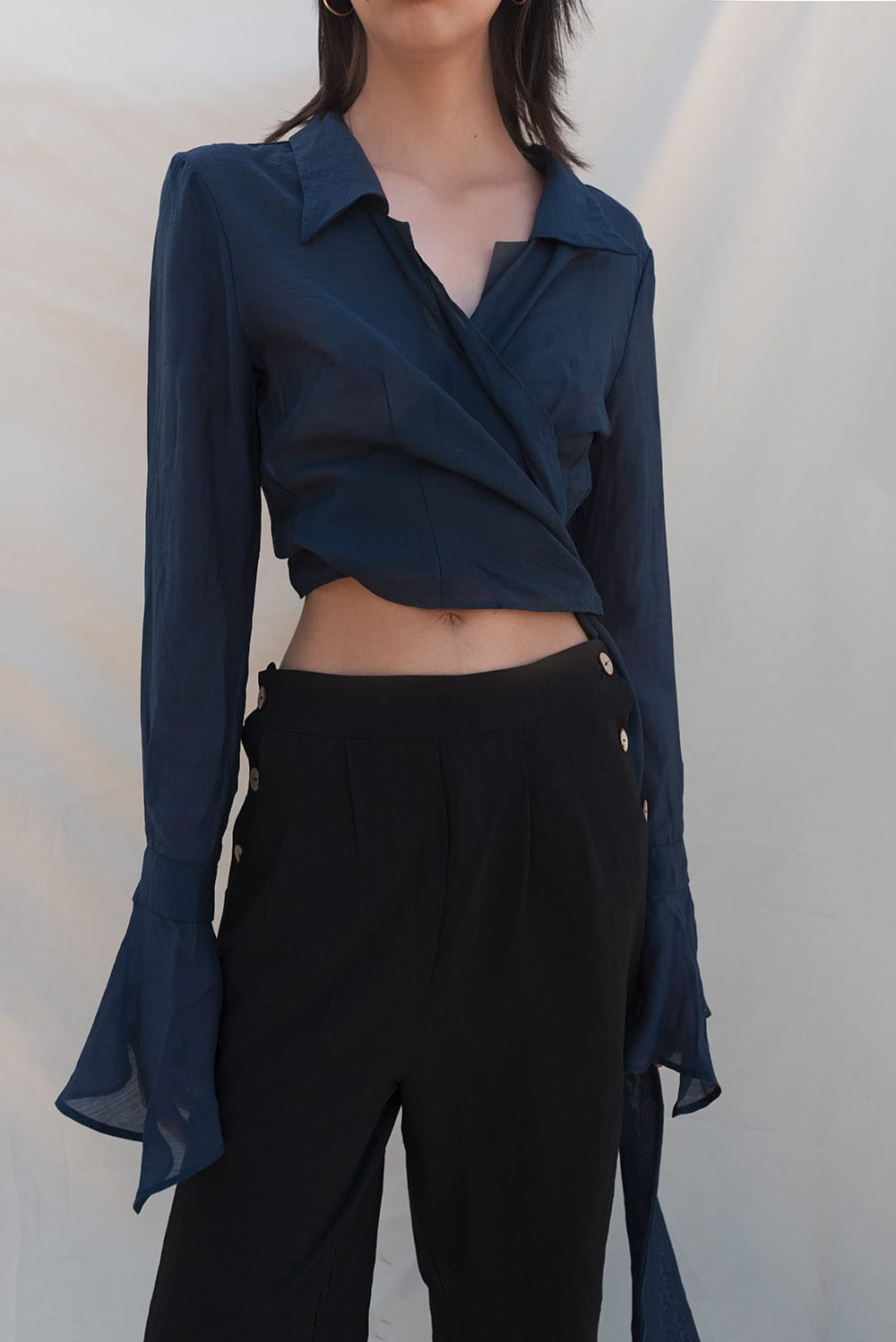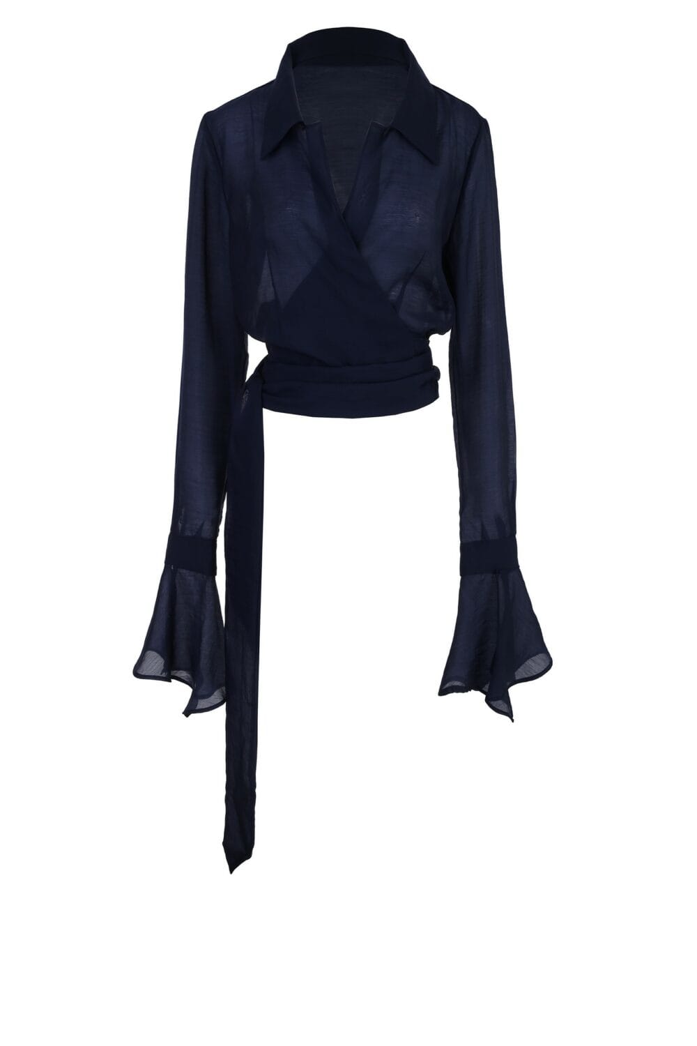 Koszula w kolorze granatowym, wiązana w pasie, z rękawem w efektowny dzwonek zapinanym na guziczek.
