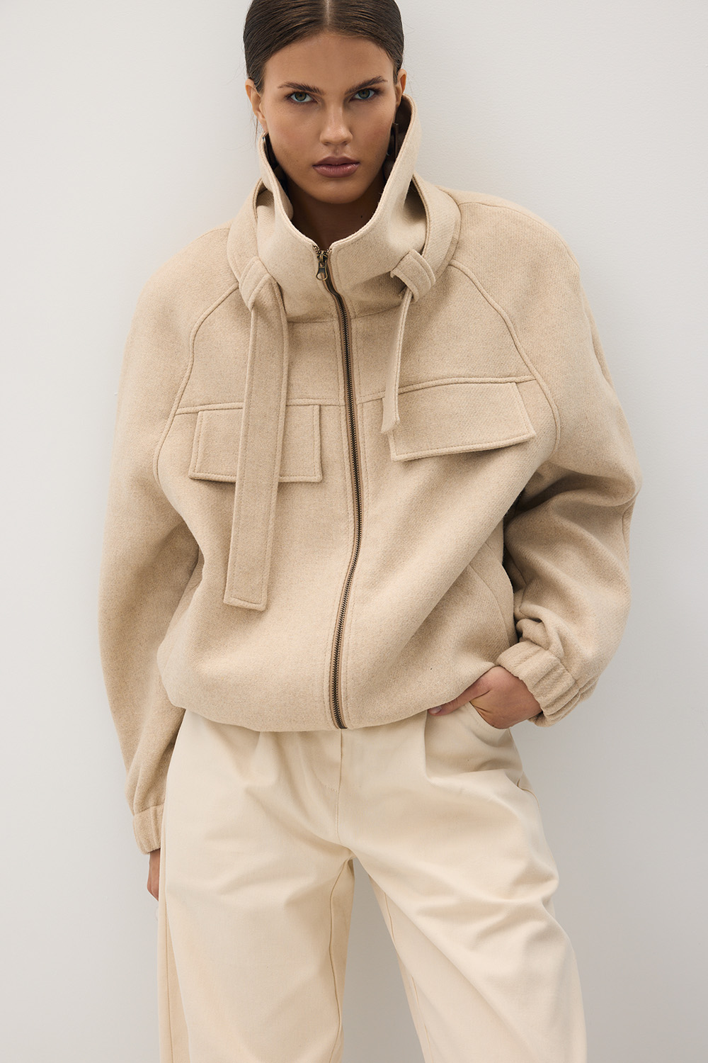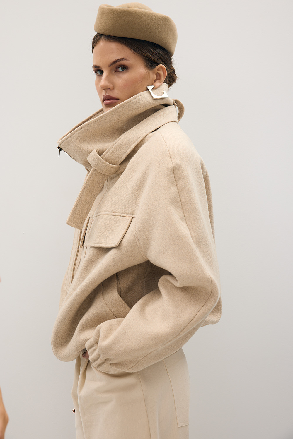 Beżowa kurtka o rzeźbiarskiej, nowoczesnej formie, wykonana z miękkiej mieszanki wełny i poliestru. Tkanina o wyraźnej strukturze łączy w sobie ciepło naturalnych włókien i trwałość syntetyku, dzięki czemu model zachowuje elegancki kształt i odporność na zagniecenia. Charakterystyczny, szeroki kołnierz i obniżona linia ramion tworzą współczesny, architektoniczny wyraz, a wiskozowa podszewka nadaje całości szlachetne, komfortowe wykończenie. Veste Beige to wyważony balans pomiędzy funkcjonalnością a estetyką — klasyka interpretowana na nowo w duchu ILO PRIVE.