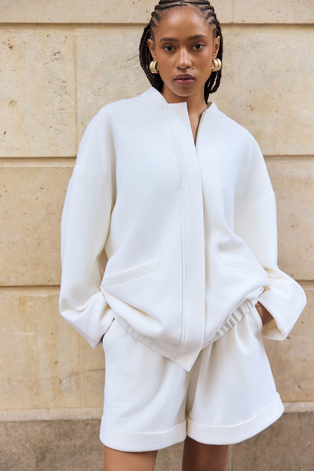 Kurtka o kroju bomberki o prostym i eleganckim kroju w kolorze off white, uszyta miekkij i ciepłej wełny dziewiczej 75% 25% nylon, podszewska 100% wiskoza)