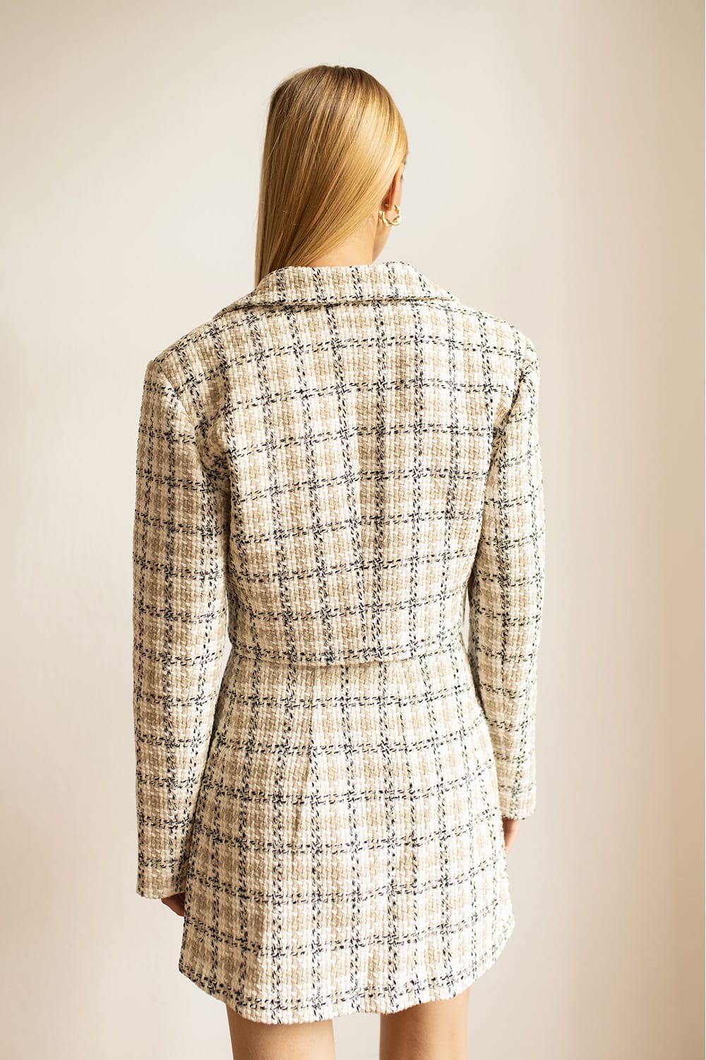 Krótki żakiet o lekko oversize’owym kroju, zapinany na guzik, wykończony elegancką podszewką oraz poduszkami w ramionach. Pięknie dopełnia stylizacje zarówno smart, jak i casual. Doskonale łączy się z szortami lub spódnicą JOUR.