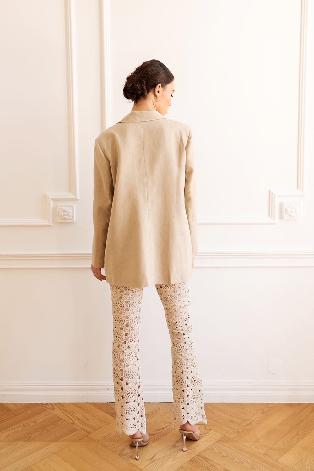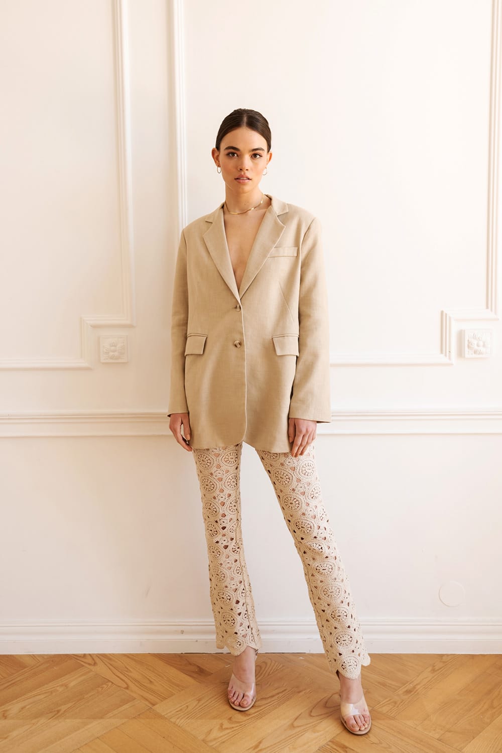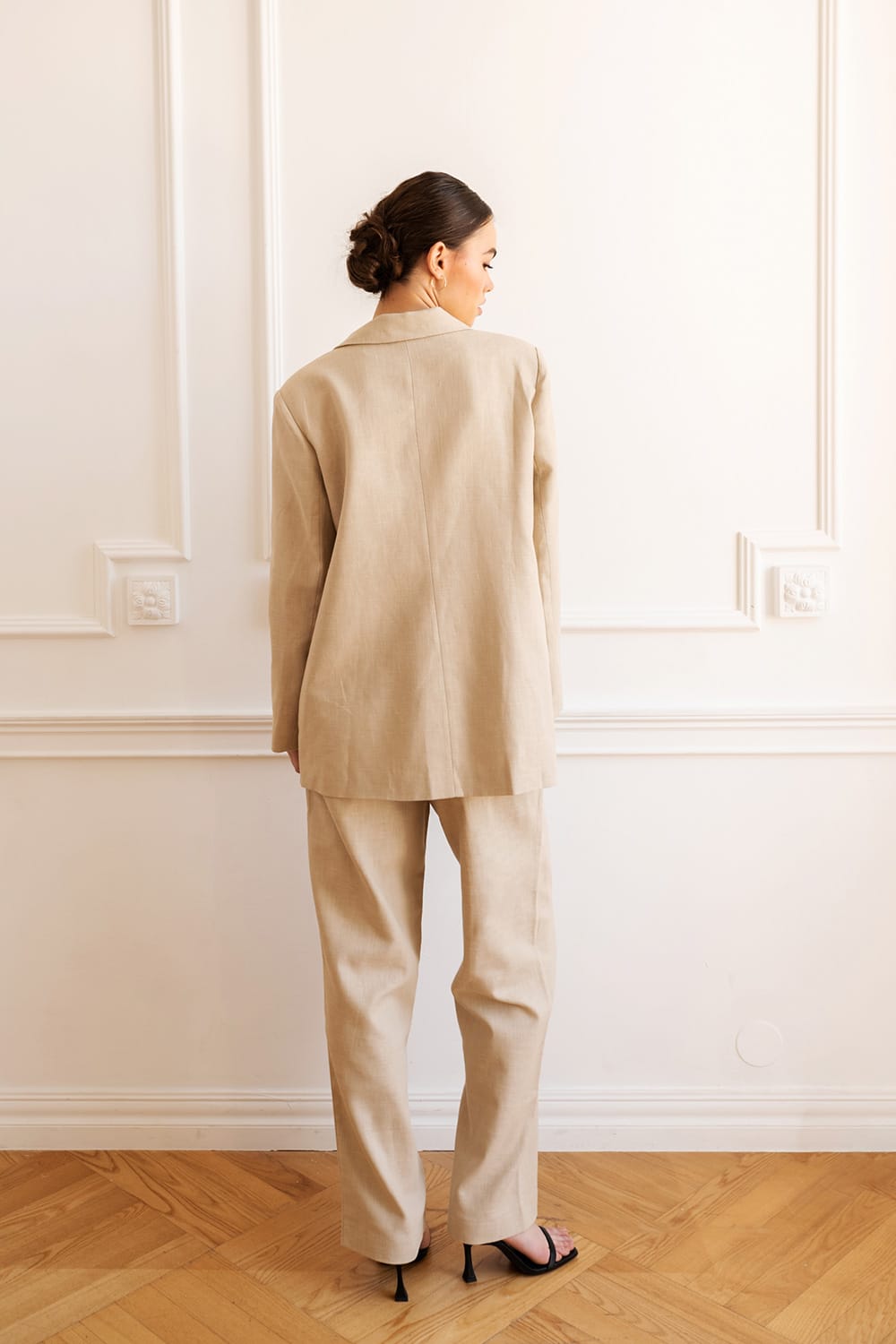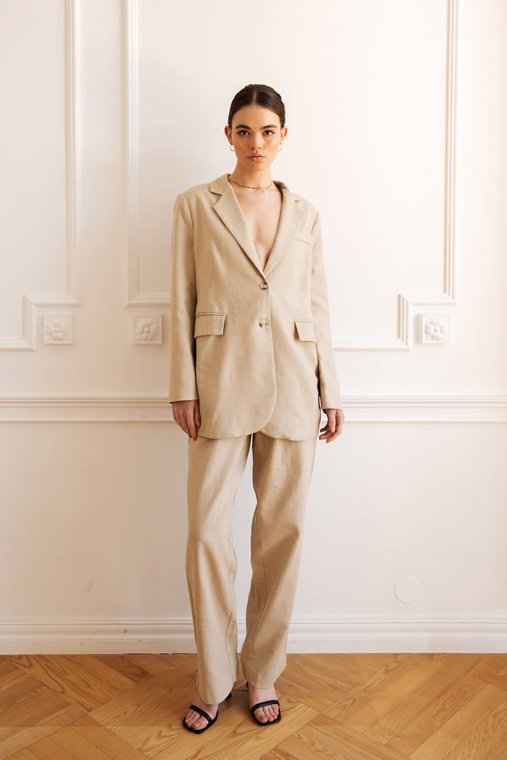 Długa marynarka o oversize’owym kroju z ozdobnymi kieszeniami, zapinana na dwa guziki, wykończona elegancką podszewką. Świetna do absolutnie wszystkiego, od sukienek, aż po nasze zestawy garniturowe.
