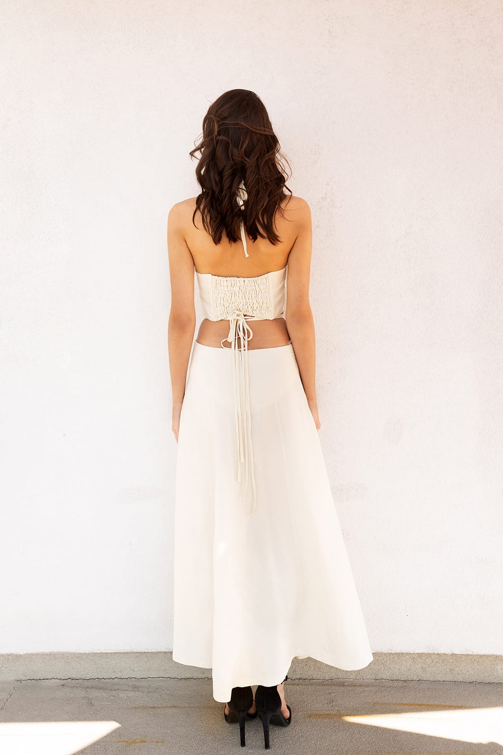 Efektowna spódnica z ozdobnym wiązaniem dookoła pasa, lekko opadająca na biodra, z tyłu zapinana na zamek. Doskonale prezentuje się w zestawieniu z topem NIVES.