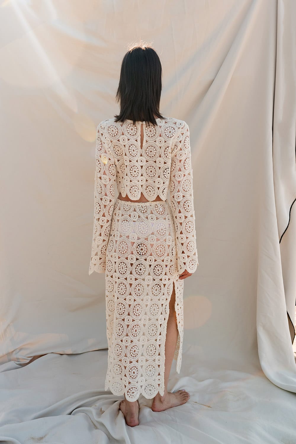 Długa spódnica z makramy bawełnianej, z efektownym bocznym rozcięciem i ozdobnym wykończeniem, z boku zapinana na zamek.