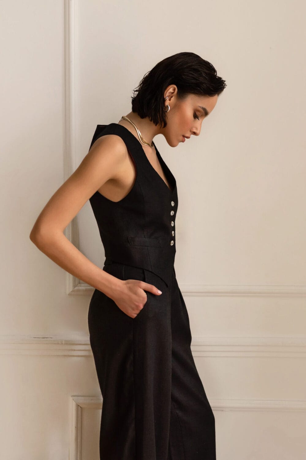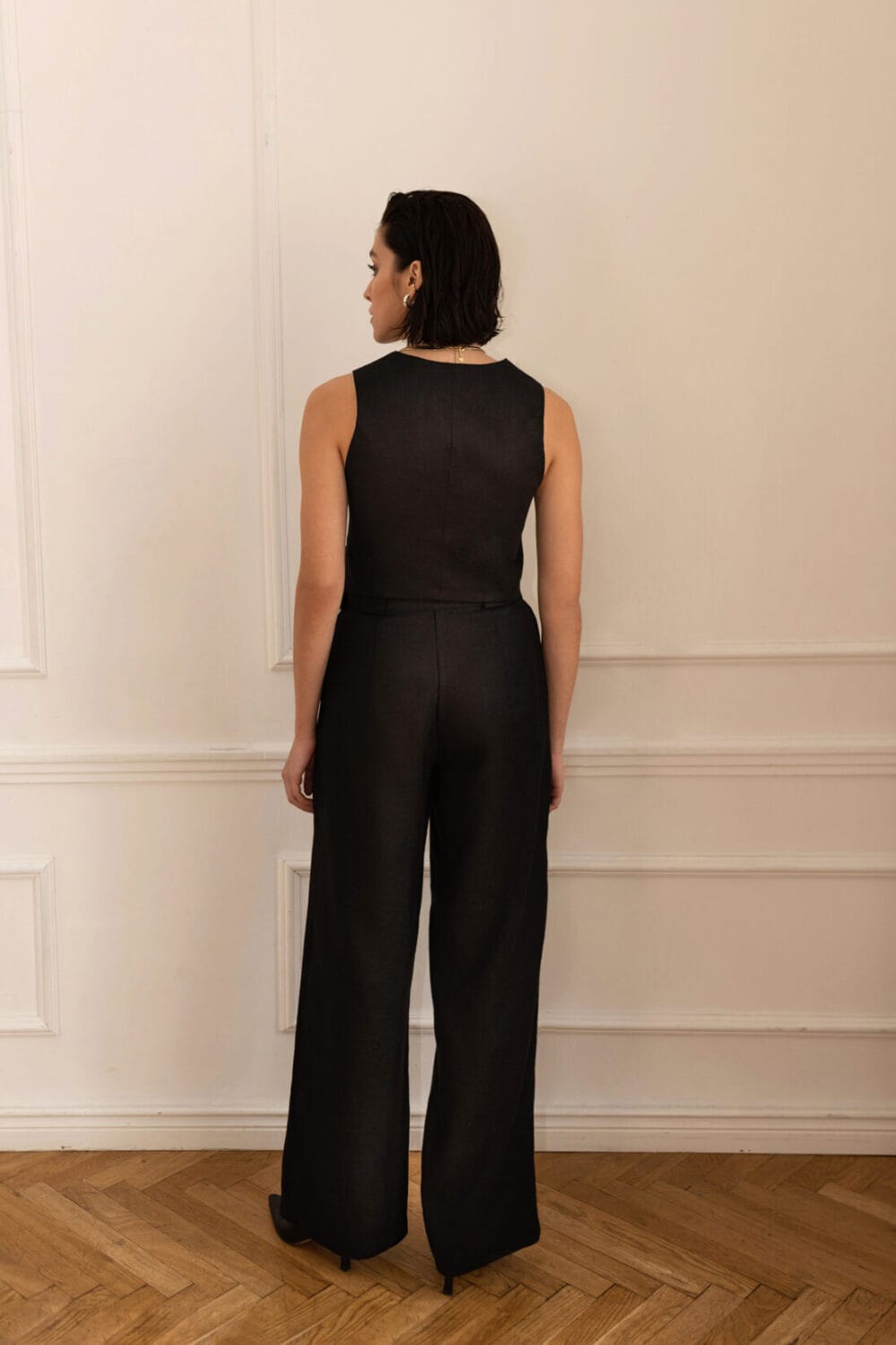 Długie spodnie o garniturowym kroju z wysokim stanem, zapinane na haftkę ukrytą pod ozdobnym paskiem. Esencja elegancji i wygody.