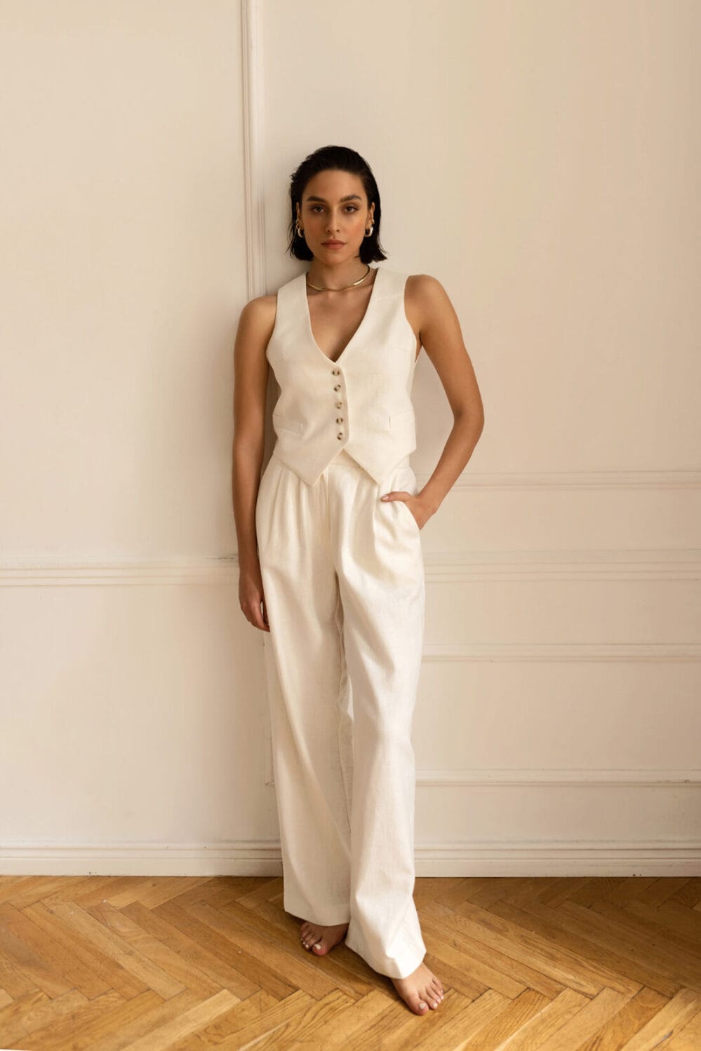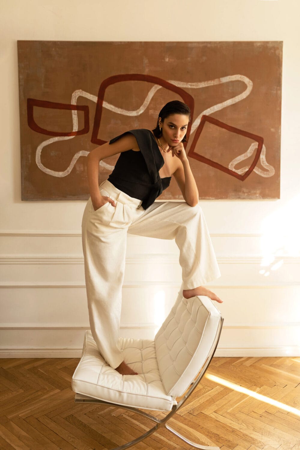 Długie spodnie o garniturowym kroju z wysokim stanem, zapinane na haftkę ukrytą pod ozdobnym paskiem. Esencja elegancji i wygody.