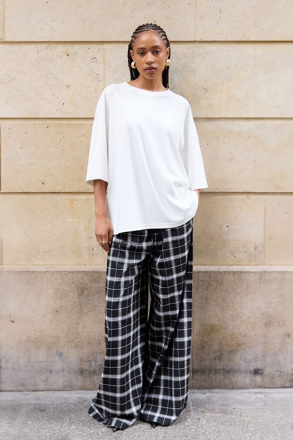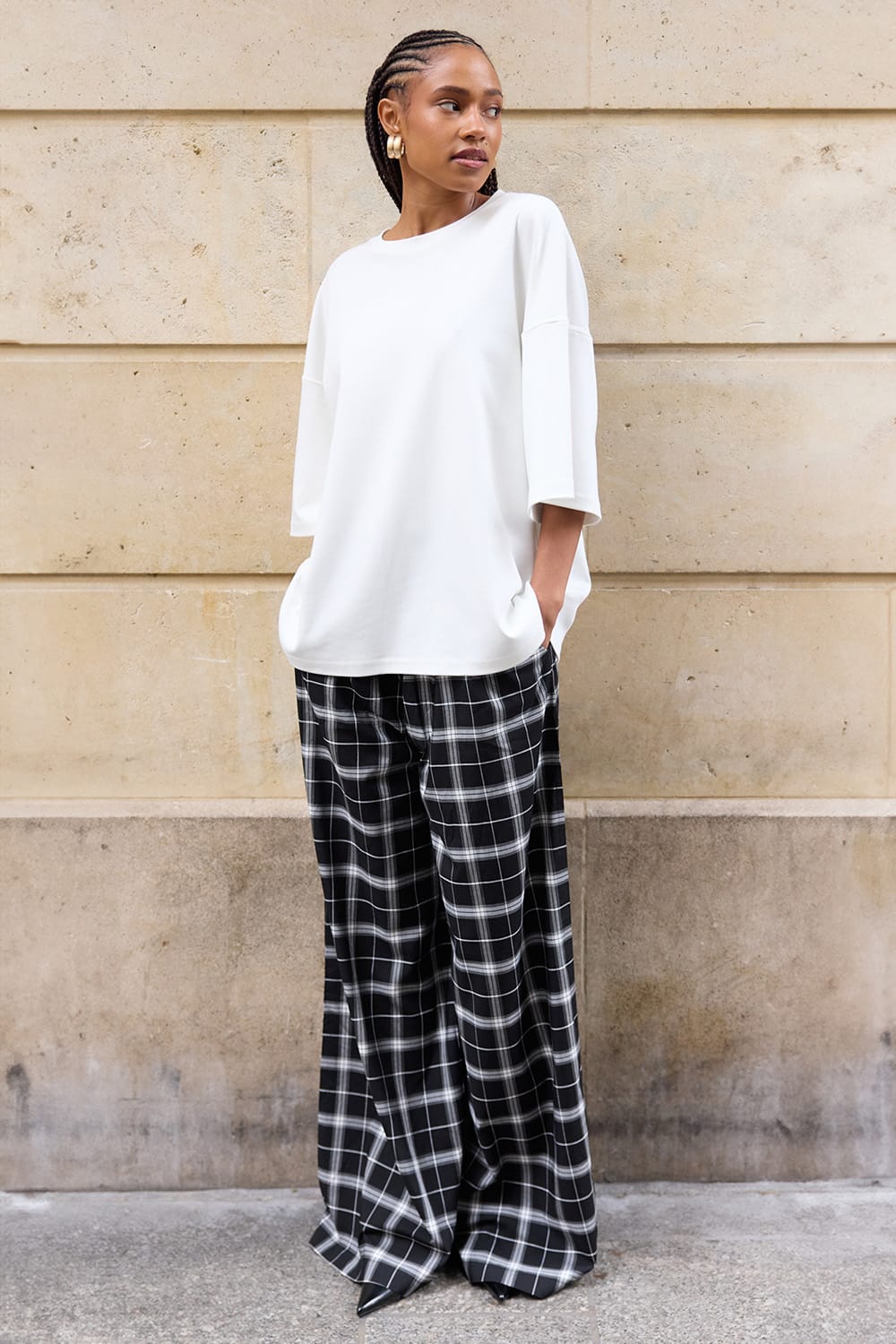 Szerokie spodnie w klasyczną, czarno-białą kratę z praktycznymi kieszeniami. Zapinane na zamek i wykończone guziczkiem. Ten model to gorący trend z wybiegów i absolutny „must-have” tego sezonu. Założysz je do każdych butów, przez co sprawdzą się w każdej okazji, od casulalowej do formalnej. EDYCJA LIMITOWANA.
