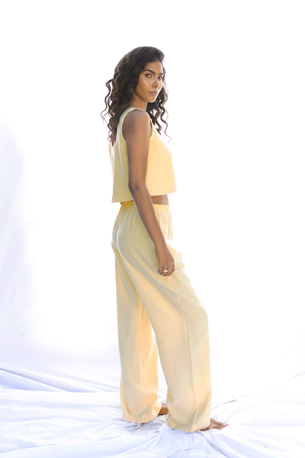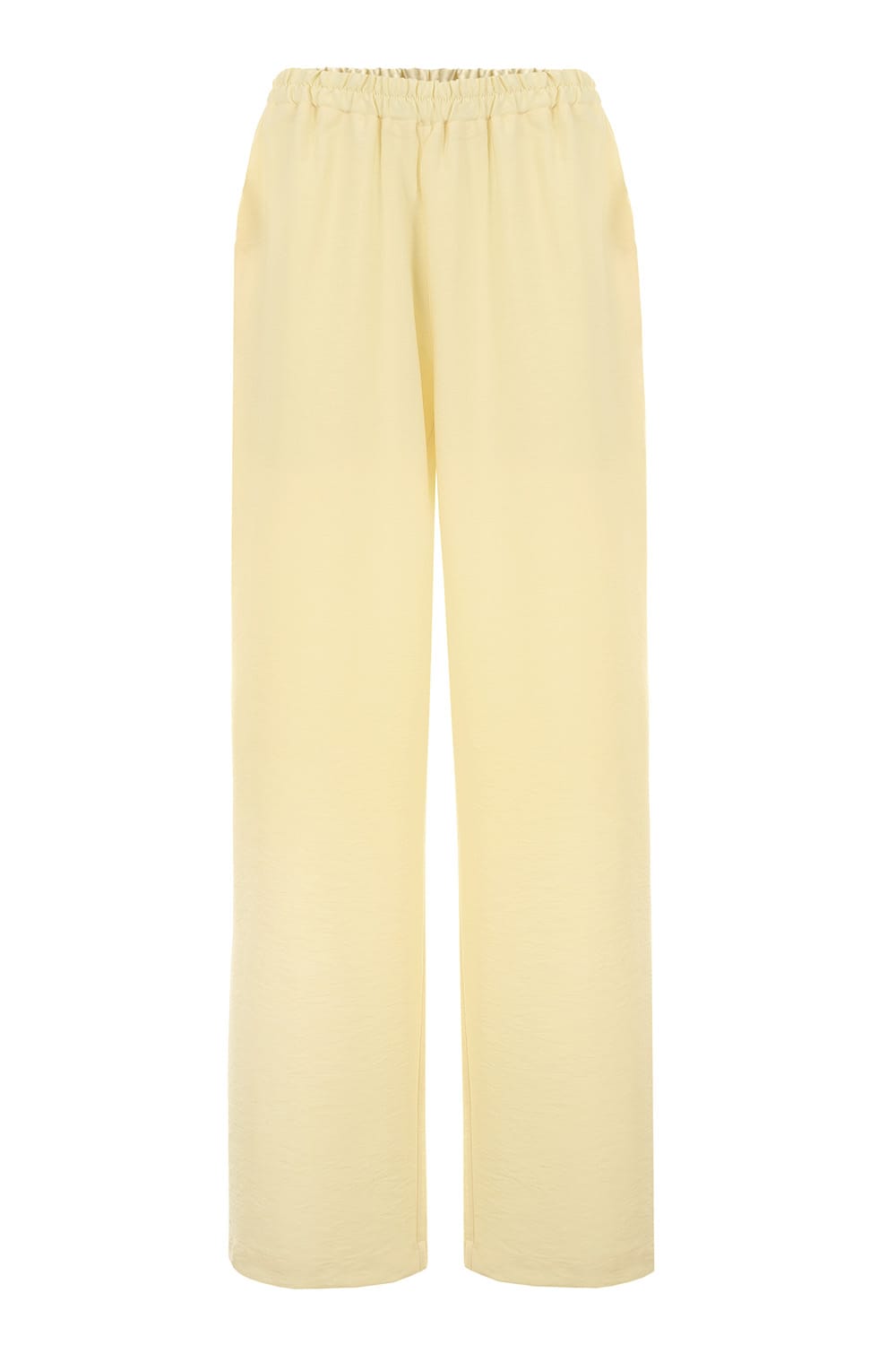 Luźne letnie spodnie w kolorze pastelowym żółtym na gumce z kieszeniami