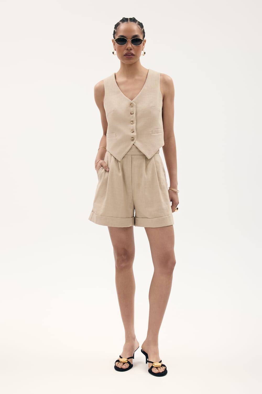 Krótkie spodnie o luźniej nogawce, z wysokim stanem, zapinane na haftkę dyskretnie ukrytą pod paskiem. Wspaniale komponują się z żakietem PARIS.
