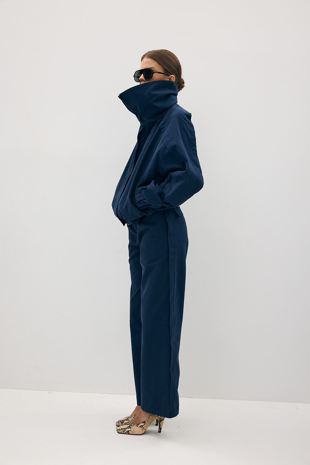 Spodnie Lara Denim Navy to współczesna wersja klasycznych spodni z szeroką nogawką, wykonana z grubej, strukturalnej bawełny przypominającej jeans. Mają perfekcyjnie dopasowaną talię i miękko opadający krój, który dodaje sylwetce nowoczesnej lekkości.