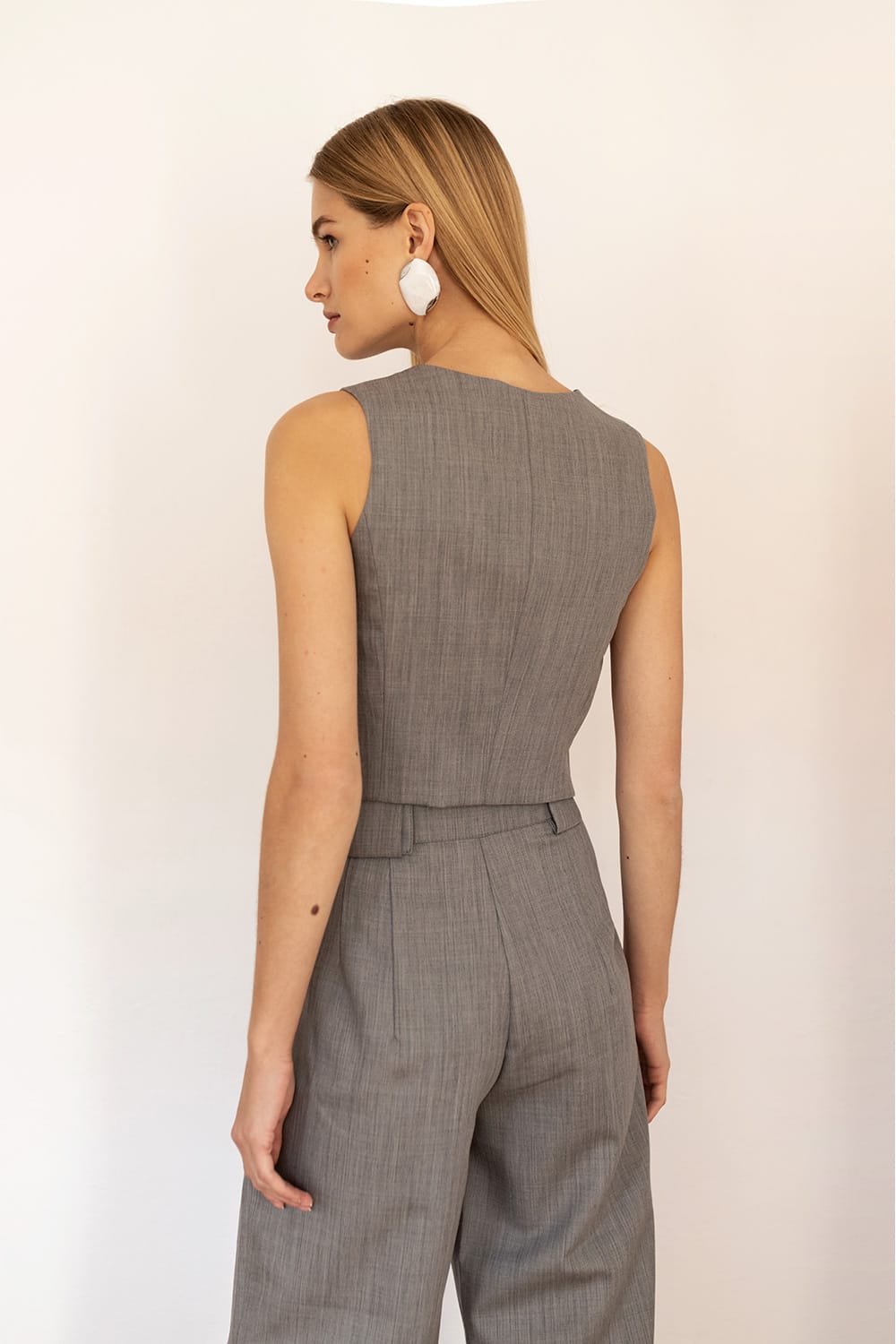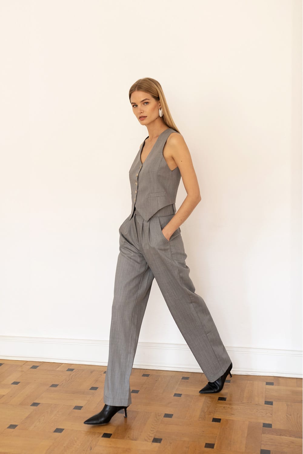 Długie spodnie o garniturowym kroju z wysokim stanem, zapinane na haftkę ukrytą pod ozdobnym paskiem. Esencja elegancji i wygody, która sprawdzi się w stylizacjach formalnych i casualowych. W komplecie z kamizelką i żakietem PARURE współtworzy zestaw garniturowy.