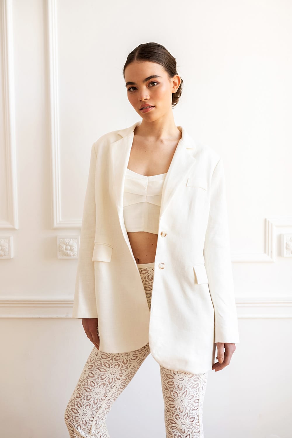 Długie, ażurowe spodnie wykonane z włoskiej koronki, z wdzięcznie wykończoną nogawką, zapinane na zamek. Na plażę i do miasta! Doskonałe w zestawie z bluzką SOLEIL.