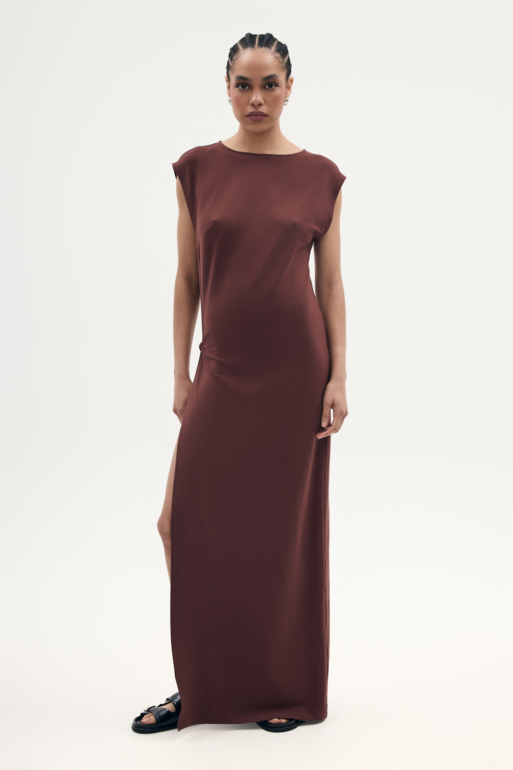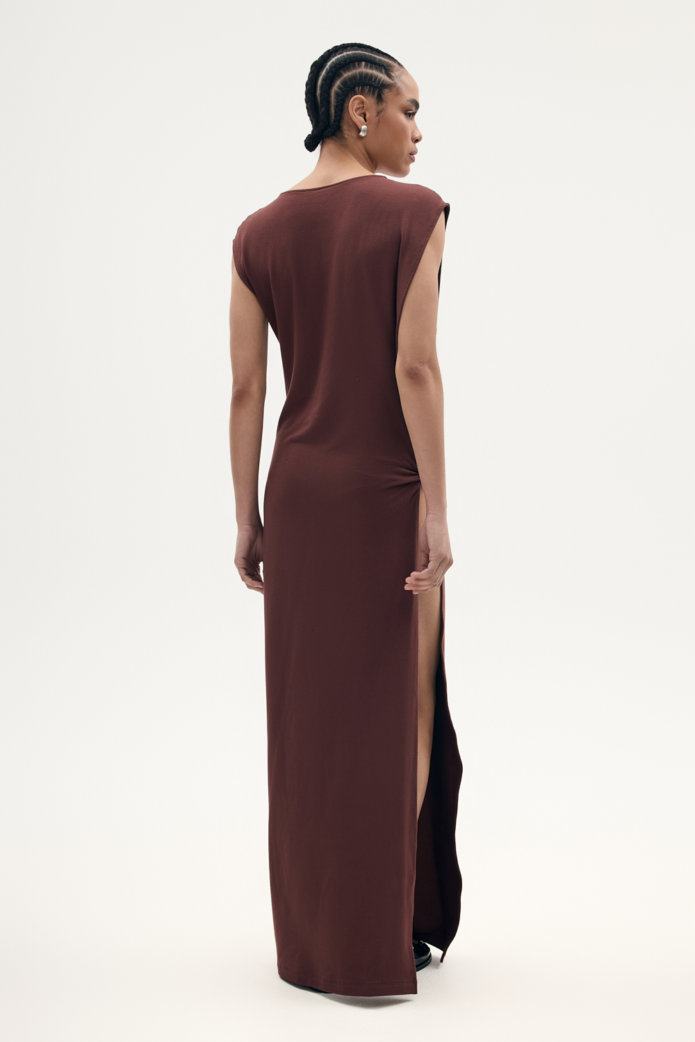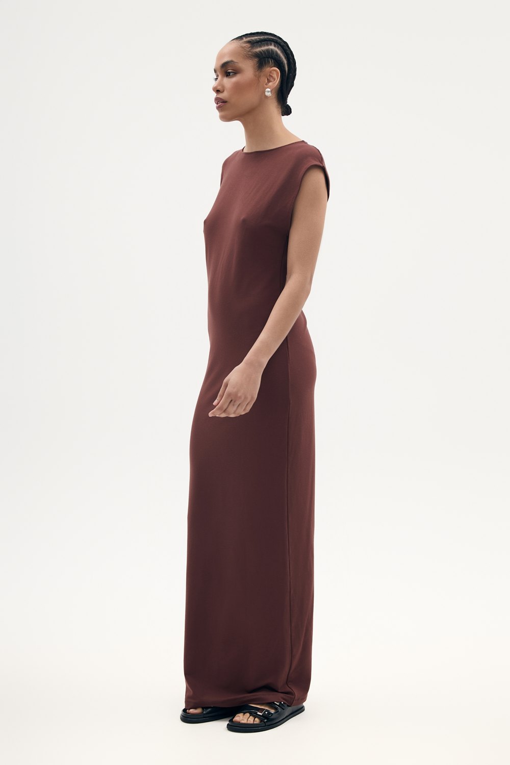 Sukienka maxi z dzianiny bambusowej o prostym kroju w czekoladowym kolorze