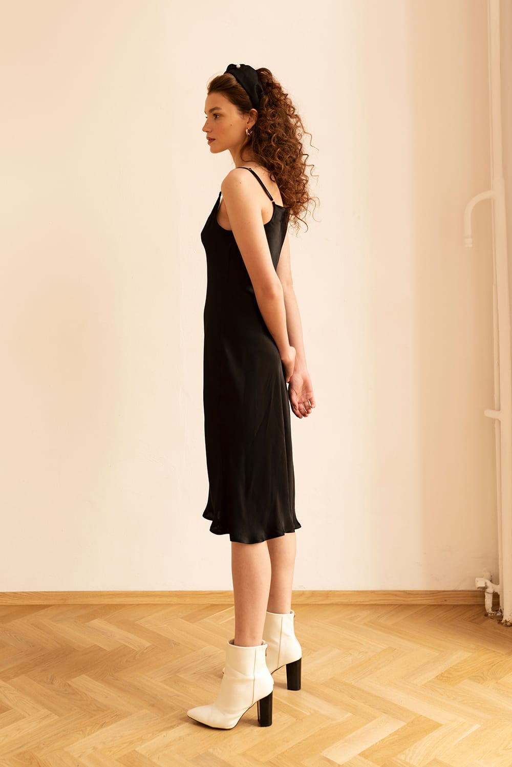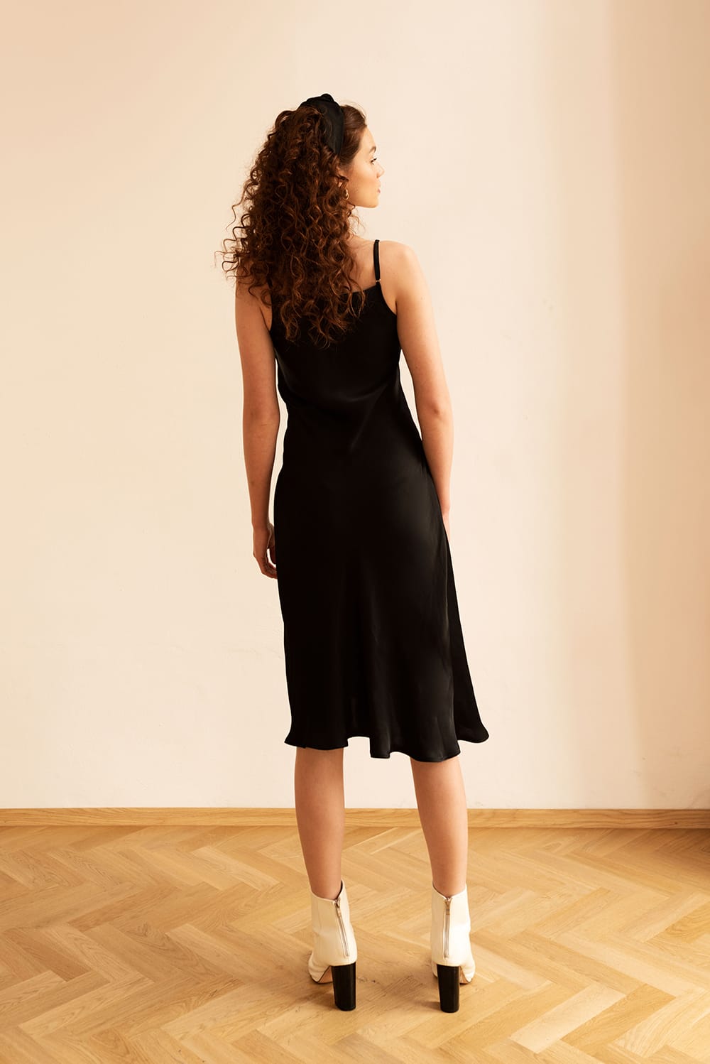 Sukienka midi typu „sleepdress”, szyta ze skosu z regulowanymi ramiączkami i dekoltem w delikatne V. Prosta i wyjątkowa.
