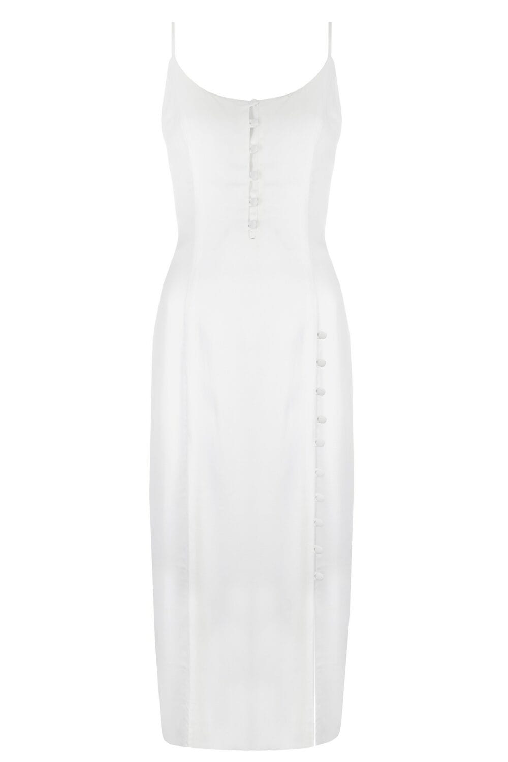 Sukienka z wiskozy satynowej o dopasowanym kroju, uszyta z podwójnej warstwy tkaniny z rozcięciem ozdobionym powlekanymi guziczkami i pętelką.