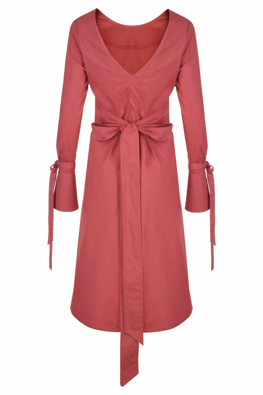 Sukienka wiązana w pasie na zakładkę, z ozdobnymi, wiązanymi mankietami w dzwonek. Można ją nosić na wiele sposobów i samemu regulować wiązanie oraz głębokość rozcięcia na nogę.