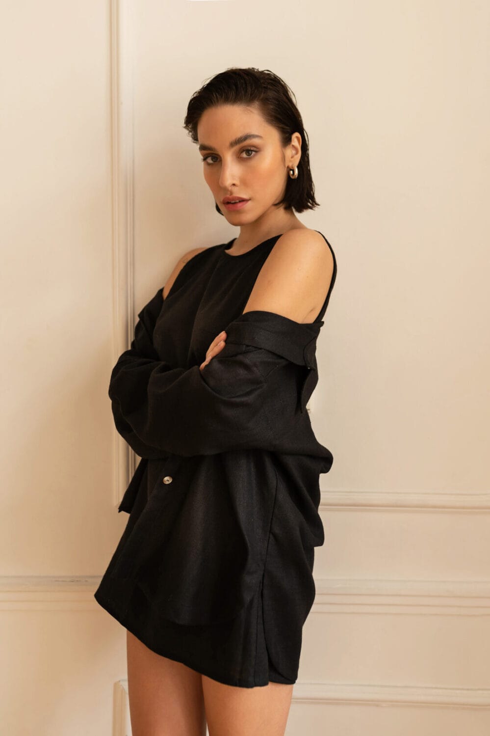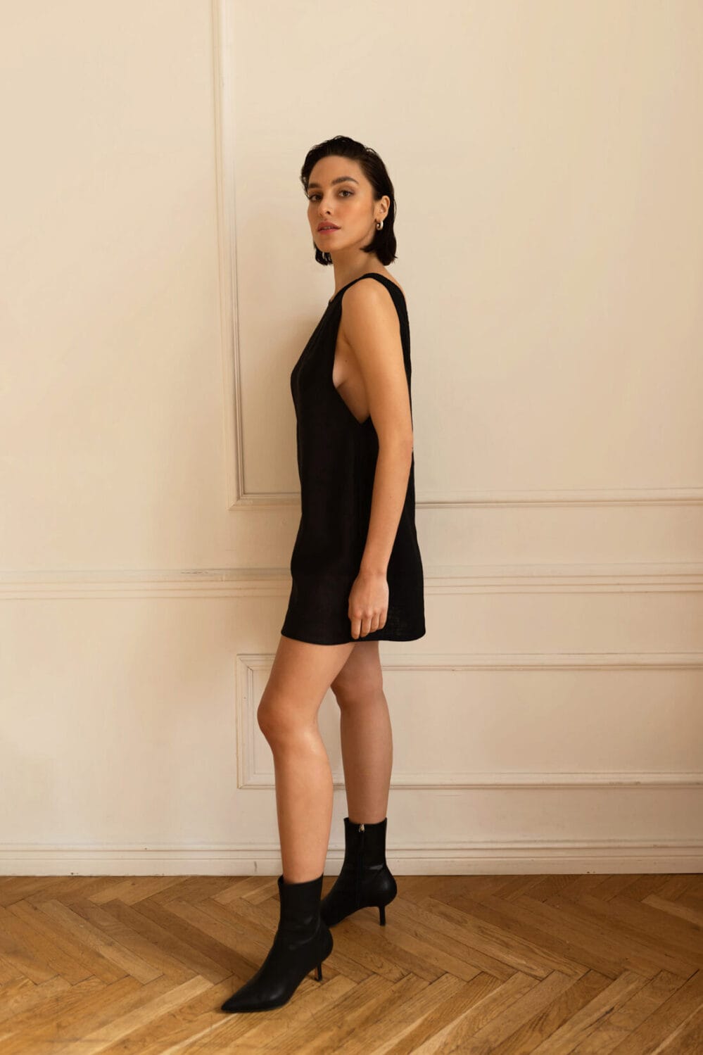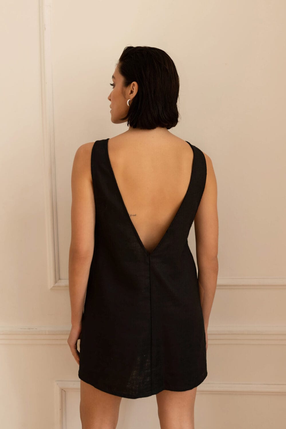 Krótka sukienka o luźnym kroju z efektownym wycięciem na plecach. Idealna na każdą porę roku.