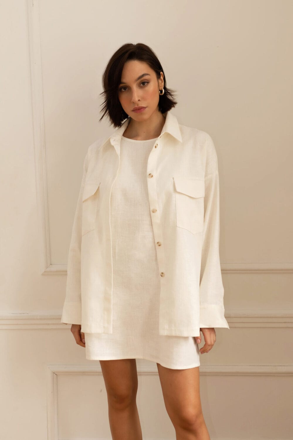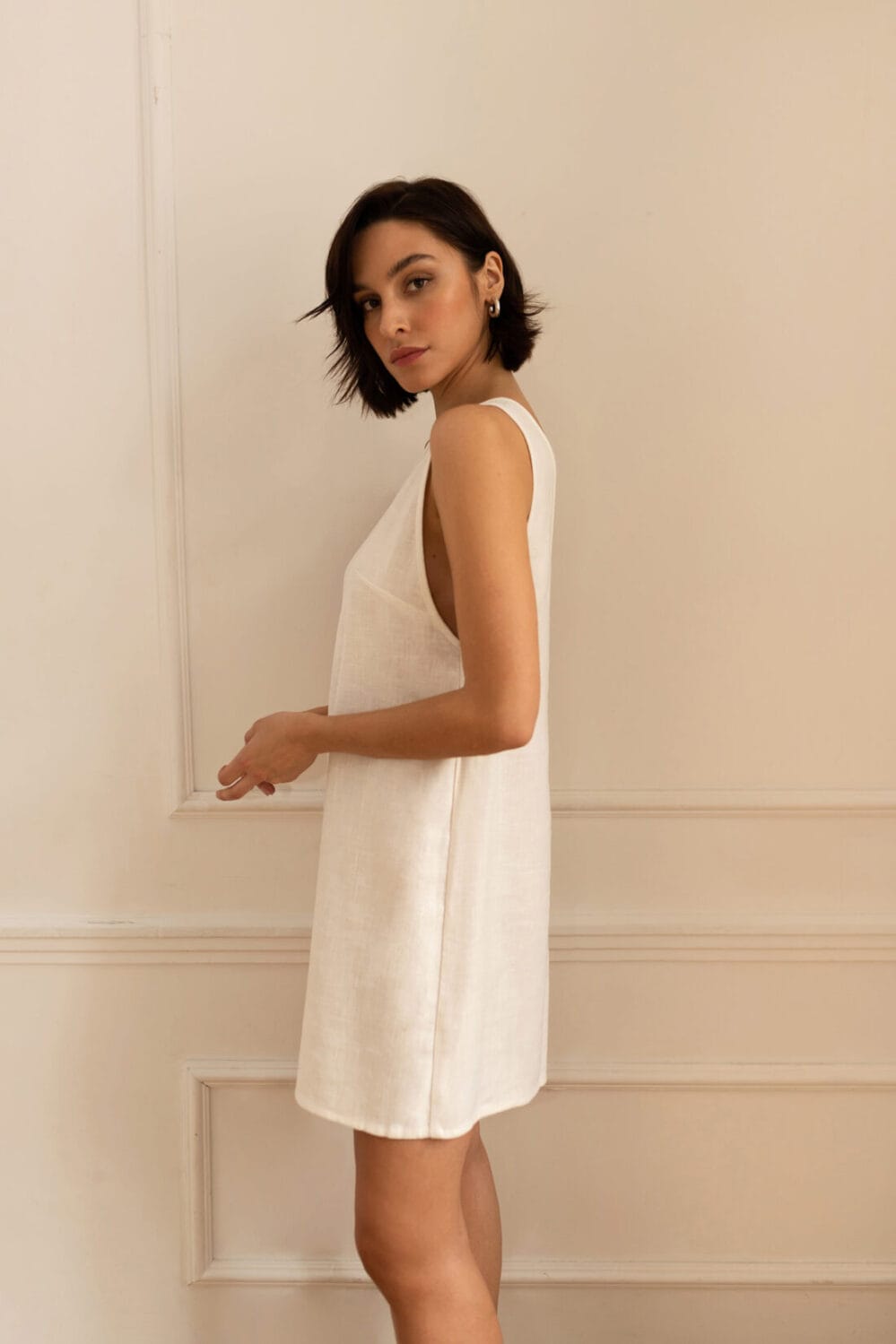 Krótka sukienka o luźnym kroju z efektownym wycięciem na plecach. Idealna na każdą porę roku.