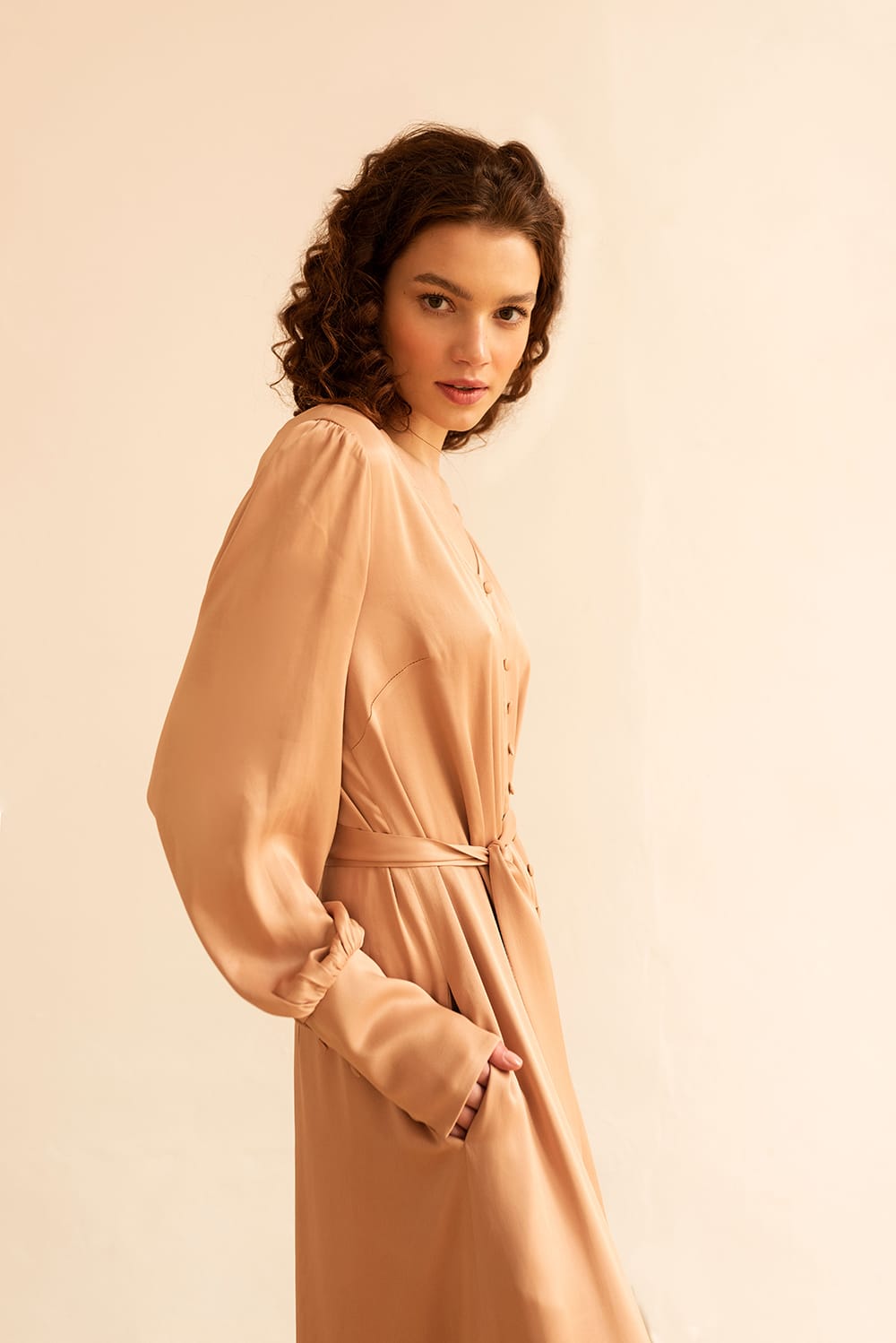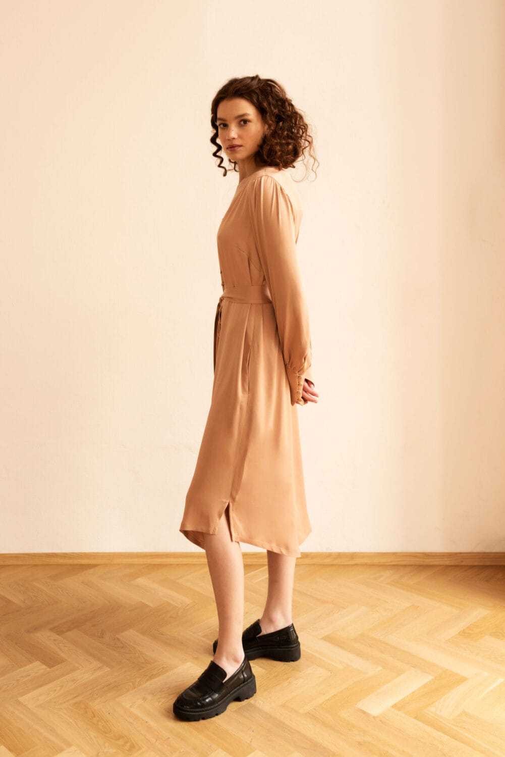 Sukienka z włoskiej wiskozy z powlekanymi efektownymi guziczkami i kieszeniami. Można nosić ją luźno lub z paskiem.