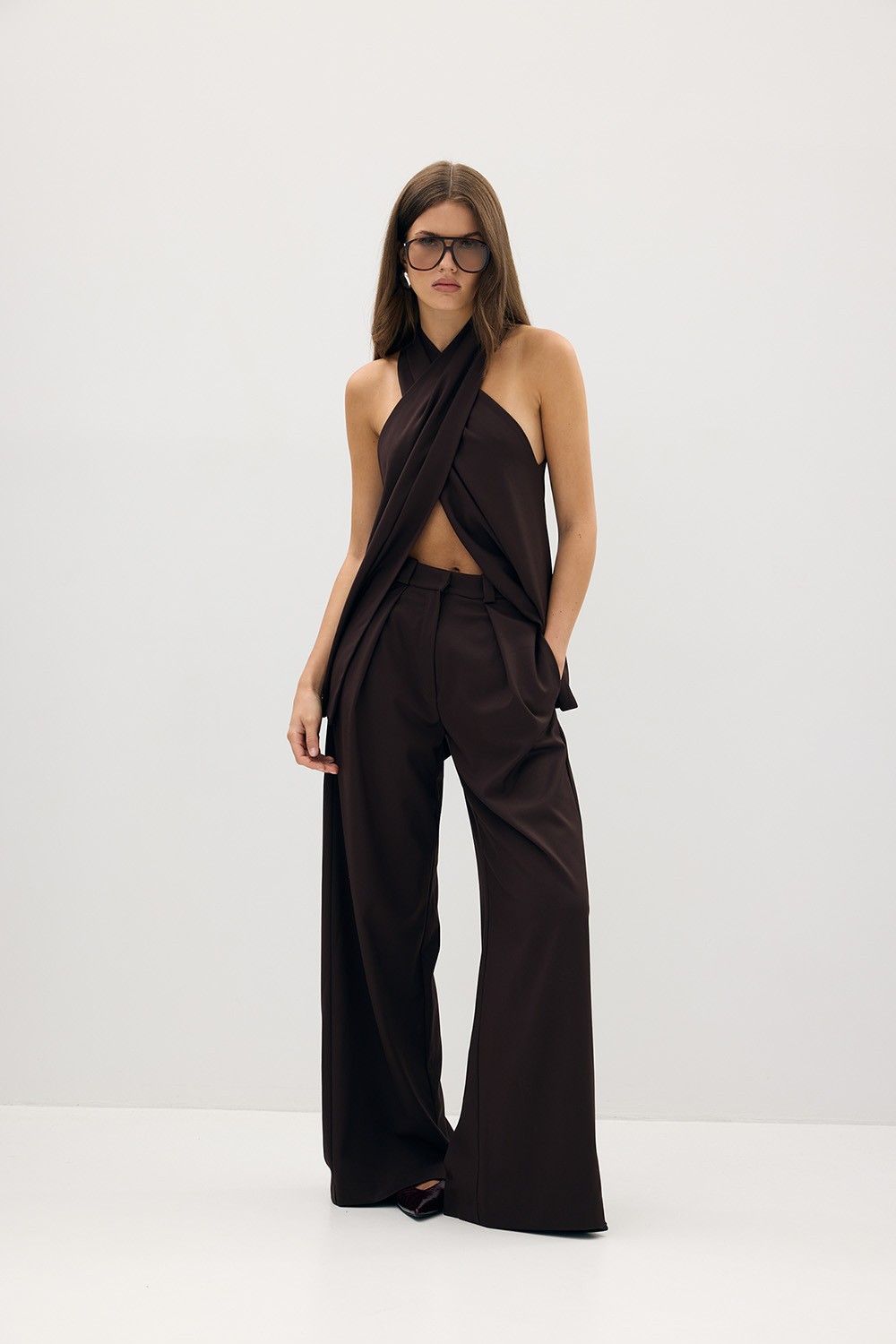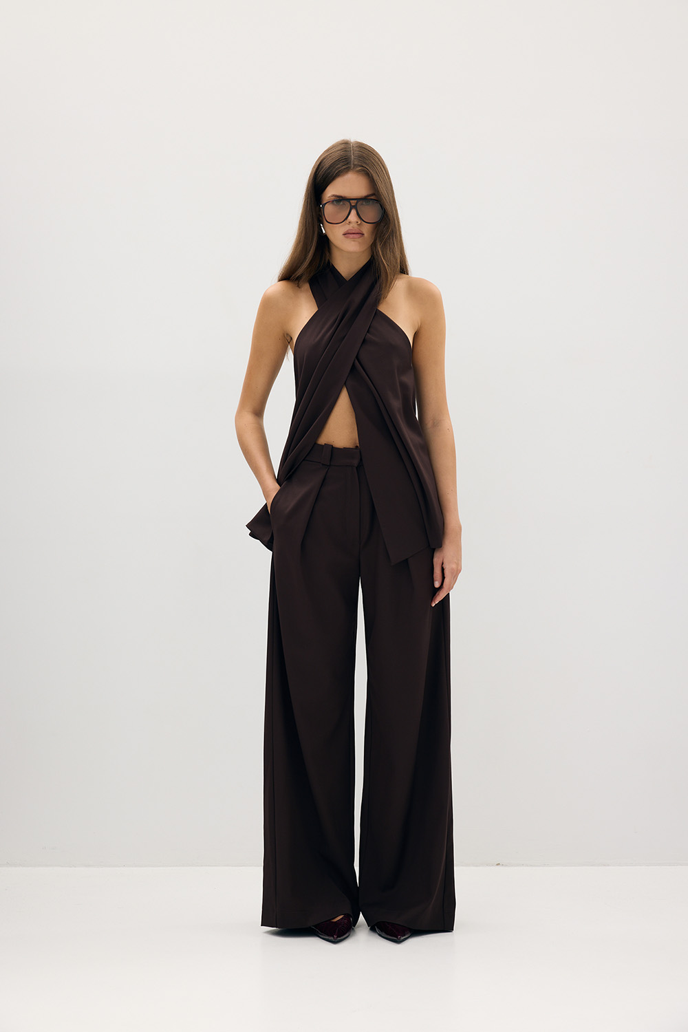 Top “Chocolat Parisien” to kwintesencja zmysłowej prostoty i paryskiego szyku. Wykonany z tej samej luksusowej tkaniny co kultowy garnitur ilo prive, zachwyca subtelnym połyskiem i miękkim wykończeniem.
