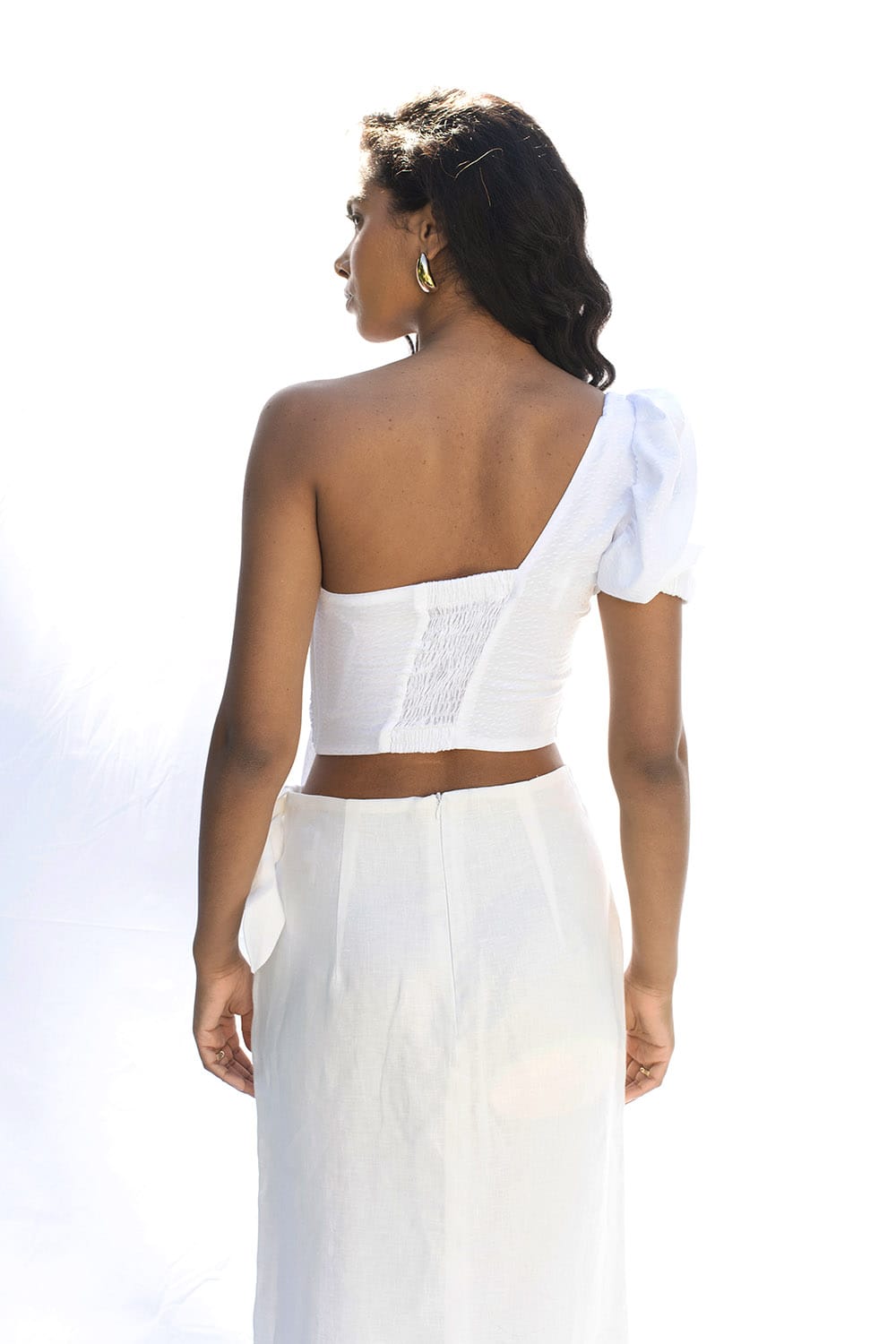 Asymetryczny top na jedno ramię z ozdobną szarfą, wzmocniony fiszbinami, zapinany na zamek. Dopracowana konstrukcja sprawia, że top nosi się niezwykle wygodnie. Seksapil, wdzięk i klasa – wszystkie zawierają się w jednej małej rzeczy. Doskonała baza do szerokiej gamy stylizacji.