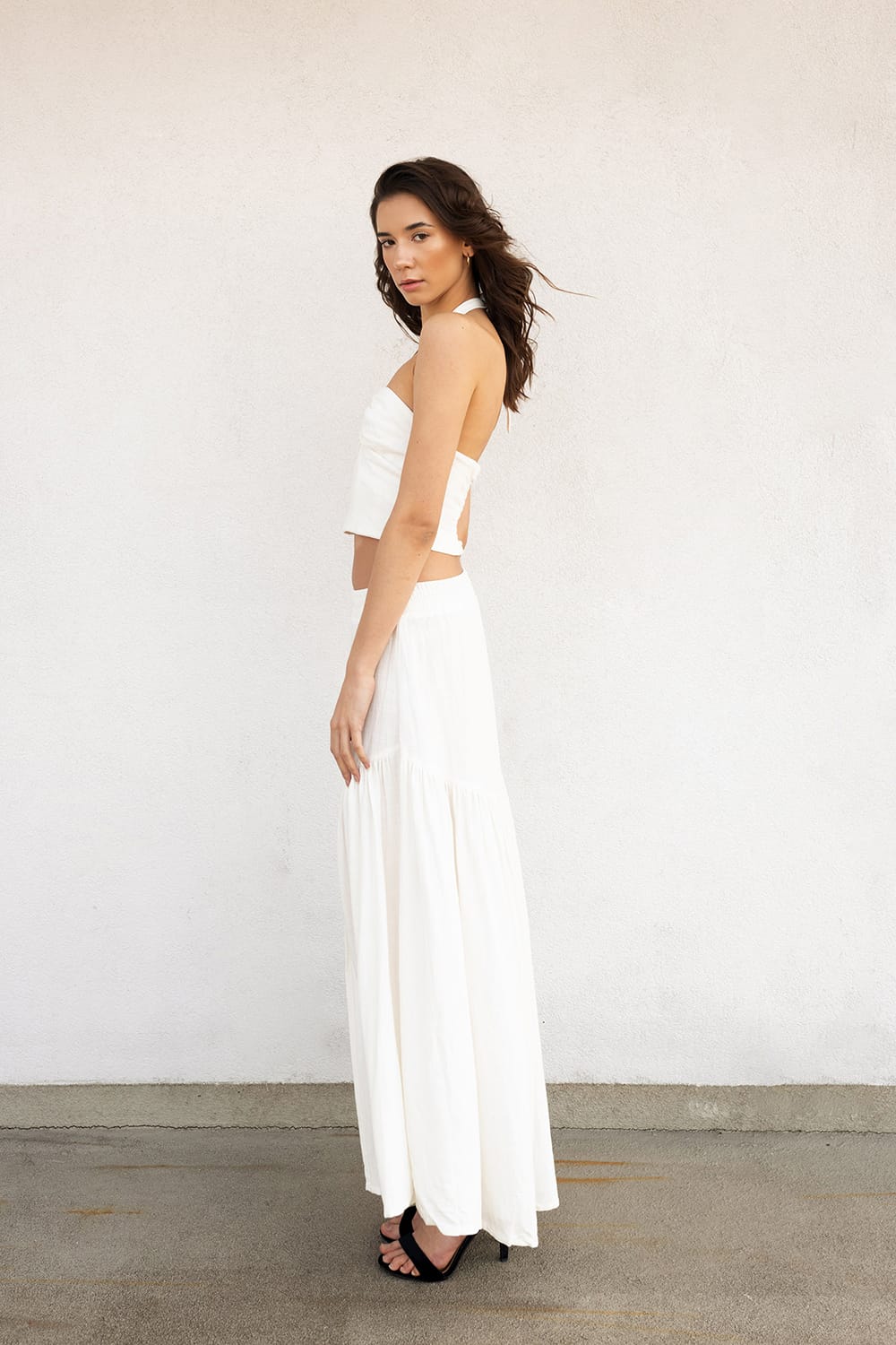 Wygodny top wiązany na szyi, uszyty z podwójnej warstwy tkaniny, z ozdobnym drewnianym kółkiem. Idealny w połączeniu ze spódnicą VIOLA.
