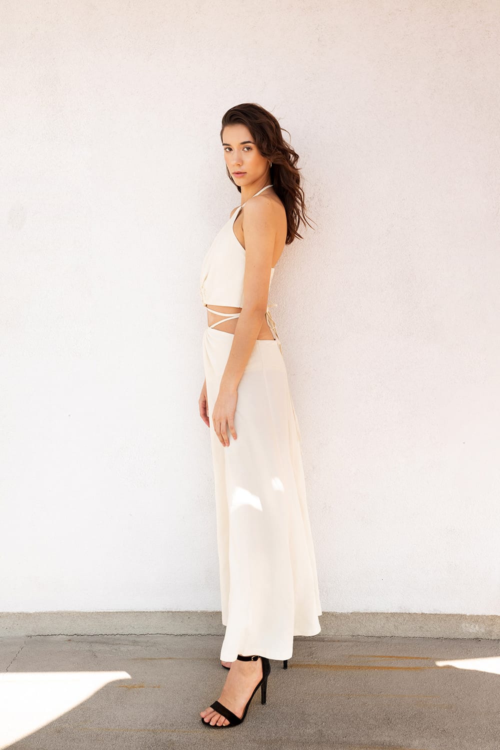 Krótki top, wiązany na szyi, na dole ozdobiony drewnianym kółkiem i wiązaniem dookoła pasa. Detale sprawiają, że prosty top zamienia się w naprawdę wyjątkowy element stylizacji. Idealny ze spódnicą NIVES.
