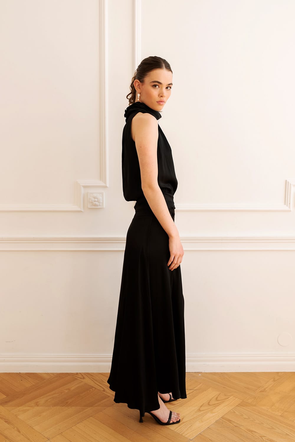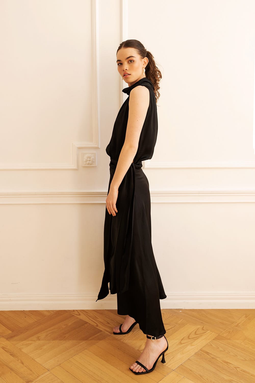 Efektowny, lejący top bez rękawów, z eleganckim golfikiem zapinanym z tyłu na guziki oraz ozdobnym wiązaniem na boku. Doskonały w zestawie ze spódnicą SOIR.